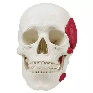 The masticatory muscles (muscle of masseter, temporal muscle, medialis of pterygoideus and muscles of lateralis) are represented in the form of elastic bands. Using this model, it is possible to show the function of the muscles masticatoire with the lower closing of the jaw, the induction of the lower opening of the jaw and side displacement and forwards jaw lower. The roof of the skull is removable.