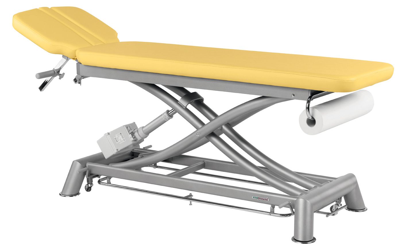 The Electric Massage Table with peripheral bar Ecopostural C7946 is a 2 parts massage table operated by an electric height adjustment with a motor controlled by foot rails. Its steel frame with white epoxy powder coating heated at 250º is equiped with a frontal piece with high resistance polypropylene curved feet and a lateral piece.