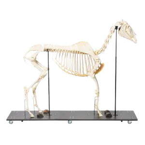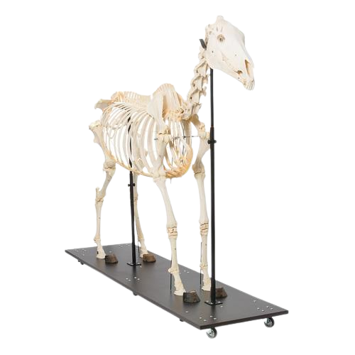 This impressive specimen of a horse skeleton comes mounted on a wooden base for easy display in the classroom. There is no better way to study the anatomy of Equus caballus then with this full horse skeleton. The complete horse skeleton makes detailed anatomical study easy. This animal skeleton is perfect for mammal and comparative anatomy studies. Delivery time upon request.