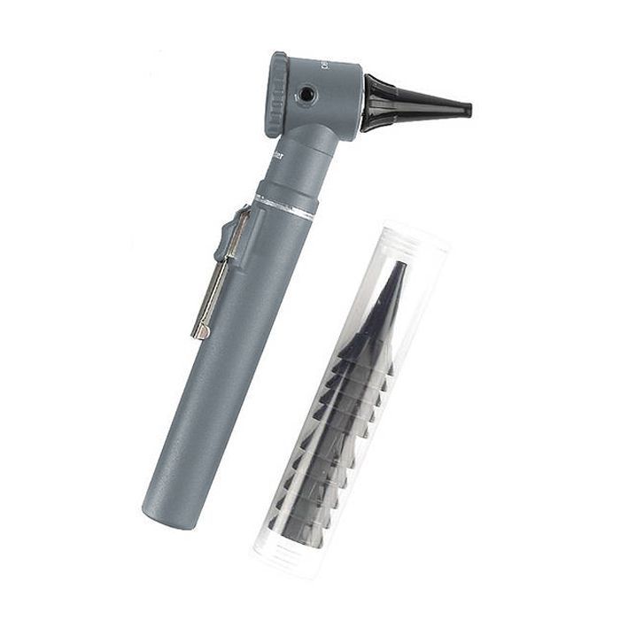 Riester Pen-Scope Otoscope - Plastic tubes each with five reusable 2.5 mm and 4 mm ear specula. - Battery handle type AA for two batteries type AA. - Batteries not supplied.