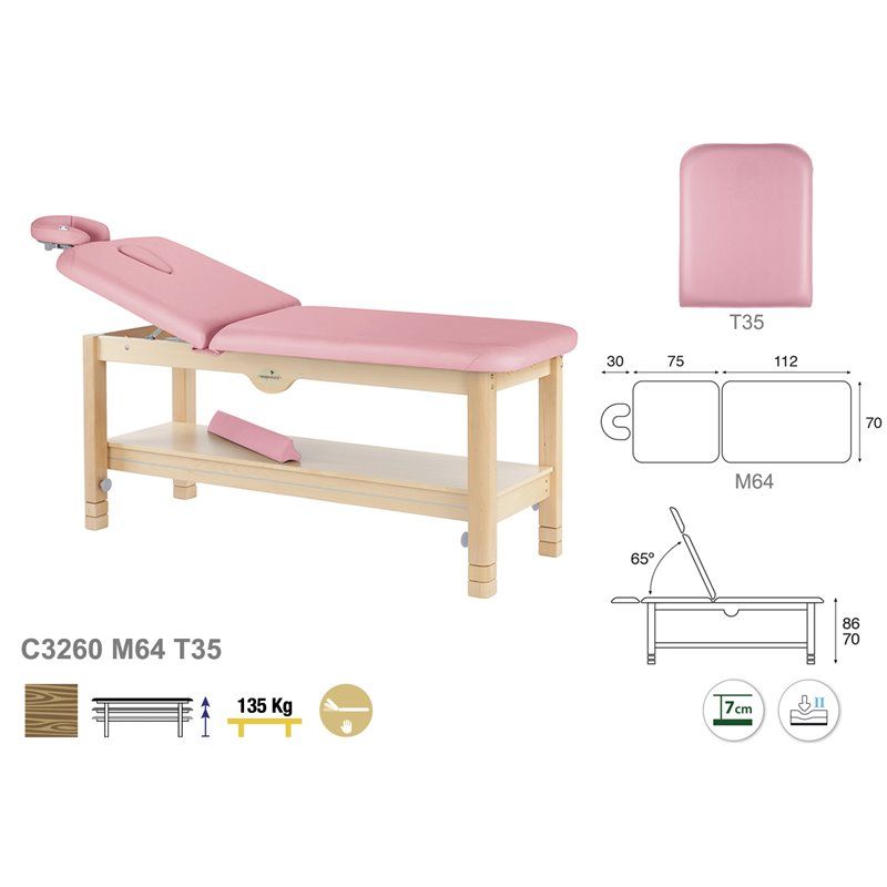 La Table de massage fixe Ecopostural C3260 est une table en bois à hauteur réglable. La variation en hauteur : 70 à 86 cm La Table de massage fixe Ecopostural C3260 est disponible en deux dimensions : - standard 70 x 188 cm (M64) - option 80 x 188 cm (M74)